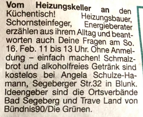 Schmalzbrote und alkoholfreie Getränke gibt es kostenlos bei Angela Schulze-Hamann, Segeberger Str.32, in Blunk.