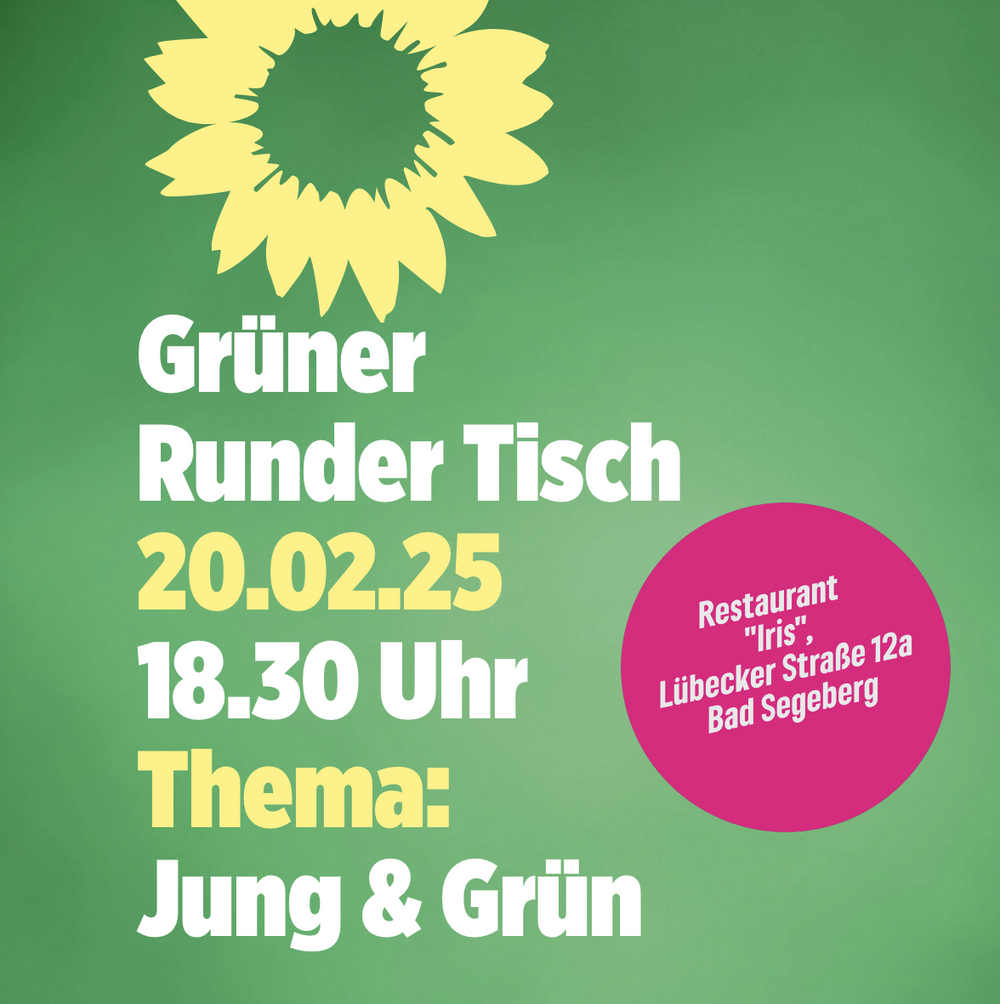 Unser nächster Grüner Runder Tisch in Bad Segeberg steht kurz bevor: am Donnerstag, 20.Februar, sehen wir um 18:30 Uhr im oberen Stock des Restaurants "Iris".