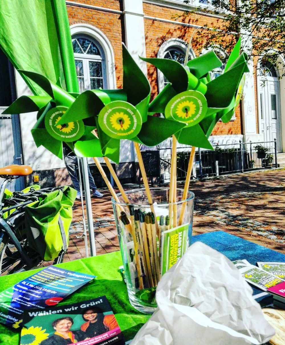 Über die grünen Ziele für ein besseres, ökologischeres, sozialeres, nachhaltigeres, gerechteres Schleswig-Holstein informieren, Windmühlen, Sonnenblumensaat-Bleistifte verschenken, diskutieren, überzeugen, auch Kritik mitnehmen.